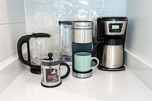 Coffee & tea bar (Keurig, Nespresso, French press, grinder, beans, teas, nespresso pods, K-cups, sugars)