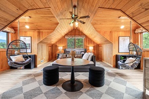 Tanbark Ridge (Upstairs): King bed, daybed + trundle, egg chairs, nearby bathroom with walk-in shower