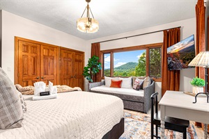 Blue Ridge Primary Suite: King bed, sleeper sofa, seating area, coffee bar, en-suite bath shared with Young Forest