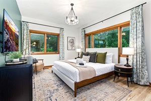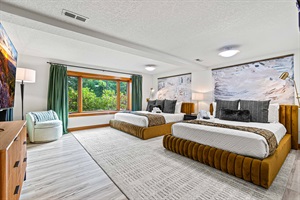 River Arts (Downstairs): King bed + Queen bed, near hallway bath with walk-in shower