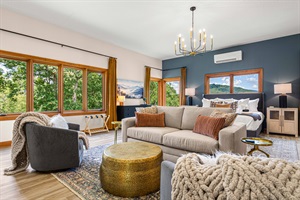 The Great Room offers cozy leather seating around the stone fireplace (seasonal), and an additional conversation nook to enjoy the view. An 85” smart TV anchors the entertainment areas, perfect for movie nights or big games. (Don't forget to bring your passwords)